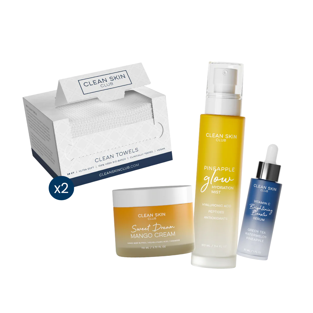 Get Up & Glow gives you everything you need to eliminate dullness and uncover radiant, hydrated, and supple skin. Added bonus, two boxes of Clean Towels- you choose which variation! Consider this bundle a necessity to achieve glowing and happy skin. All products are vegan, cruelty-free, and formulated without any harmful additives.